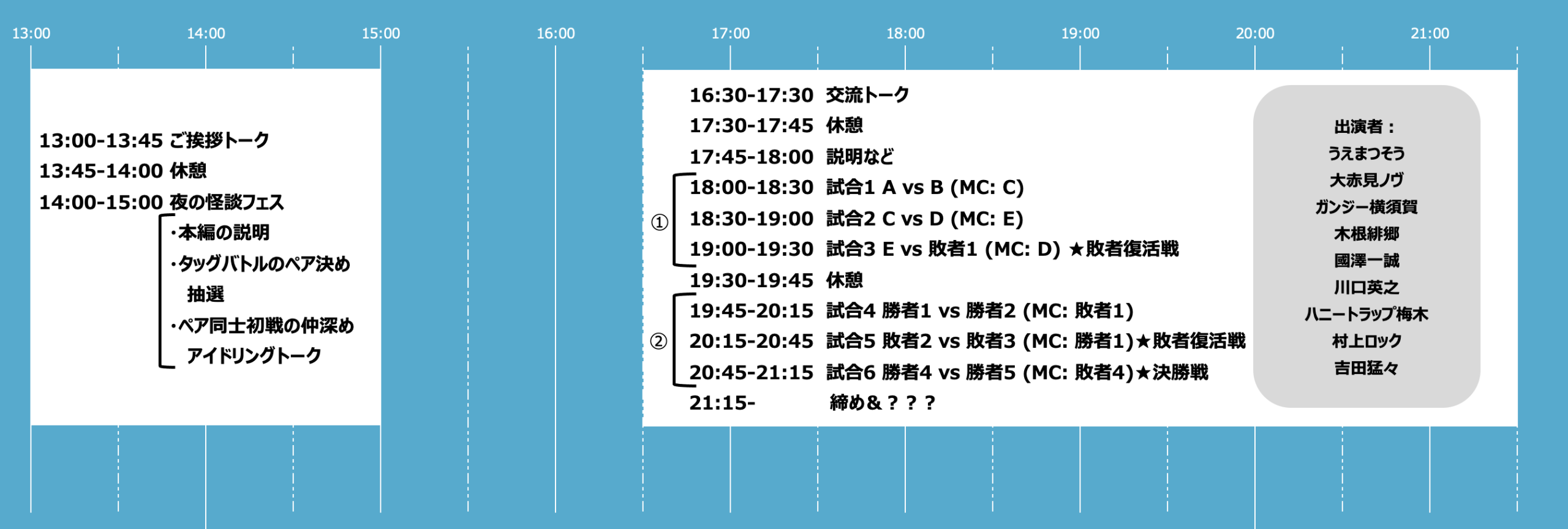 一人持ち時間は3分。相手に合わせてより強い怪談を乗せられるか?勝敗は観客の拍手にて決められます!ABCDEのチームごとのタッグマッチです。メインステージのmint hallで、この日勝つのは誰だ!?